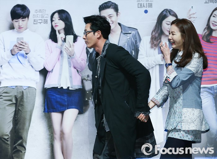 (서울=포커스뉴스) 12일 오전 서울 강남구 압구정 CGV에서 열린 영화 '좋아해줘' 제작보고회에 참석한 배우 김주혁(왼쪽)과 최지우가 포토타임을 위해 이동하고 있다.