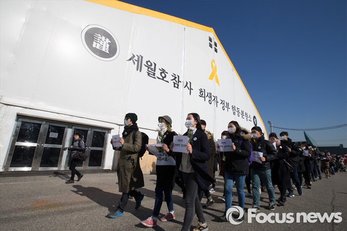 (안산=포커스뉴스) 12일 오후 경기도 안산시 세월호 사고 희생자 정부 합동분향소에서 유가족및 시민들이 416 추모식과 분향을 마친후 단원고까지 행진을 시작하고 있다.