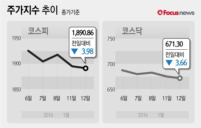 (서울=포커스뉴스) 12일 코스피지수는 전날 보다 0.21%(3.98포인트) 하락한 1890.86에 장을 마쳤다. 코스닥지수는 전일 대비 0.54%(3.66포인트) 내린 671.30에 마감했다.