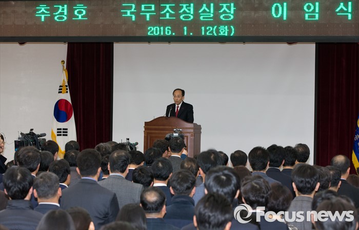 (세종=포커스뉴스) 추경호 국무조정실장이 12일 오후 세종시 정부세종청사 1동 대강당에서 열린 이임식에서 이임사를 하고 있다.
