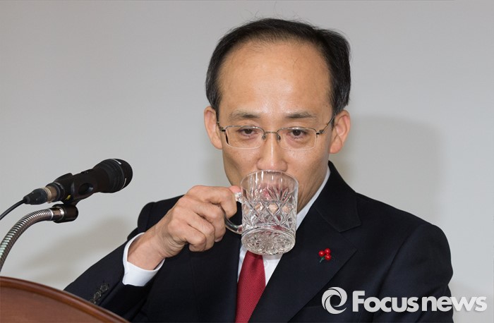 (세종=포커스뉴스) 추경호 국무조정실장이 12일 오후 세종시 정부세종청사 1동 대강당에서 열린 이임식에서 이임사 도중 목을 축이고 있다.