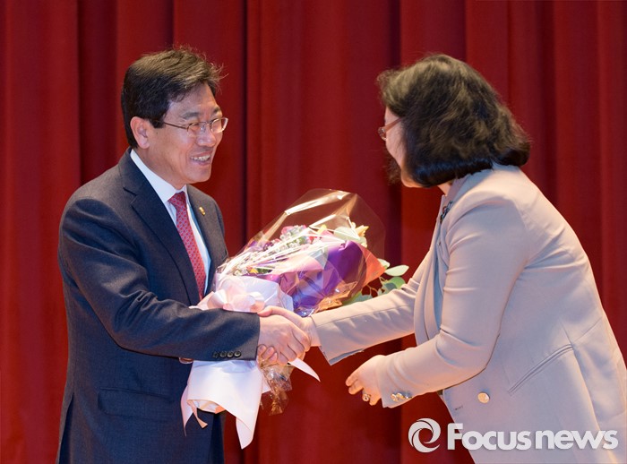 (세종=포커스뉴스) 윤상직 산업통상자원부장관이 12일 오후 세종시 정부세종청사 산업통상자원부 대강당에서 열린 이임식에서 직원대표로부터 꽃다발을 받고 있다.