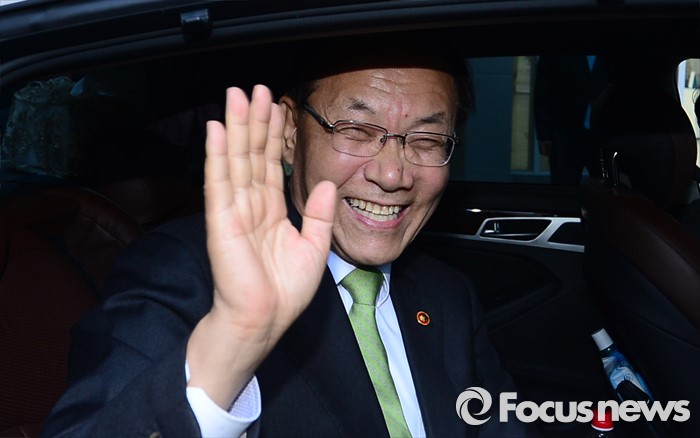 (세종=포커스뉴스) 황우여 사회부총리 겸 교육부장관이 12일 오후 세종시 정부세종청사 교육부 대회의실에서 이임식을 마치고 손인사를 하고 있다.