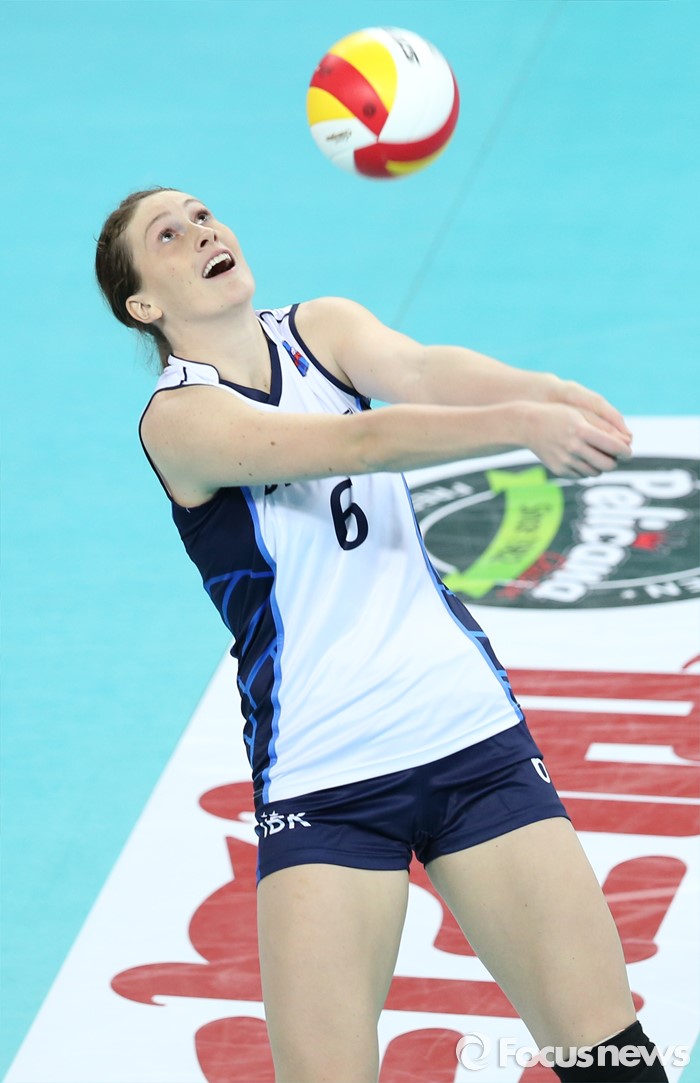 (인천=포커스뉴스) 12일 인천 계양체육관에서 열린 '2015-2016NH농협 V-리그' 여자부 흥국생명-IBK기업은행 경기에서 IBK기업은행 맥마흔이 코트 밖으로 튄 공을 살리고 있다.