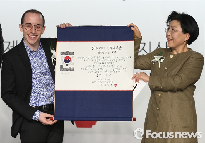 (서울=포커스뉴스) 12일 오후 서울 강남구 그랜드 인터컨티넨탈 호텔에서 한국이미지커뮤니케이션연구원(CICI) 주최로 열린 '12회 한국이미지상 시상식'에 참석한 타일러 라쉬(왼쪽)가 한국 이미지 징검다리상을 수상 후 포즈를 취하고 있다. 왼쪽부터 타일러 라쉬, 최정화 CICI 대표.