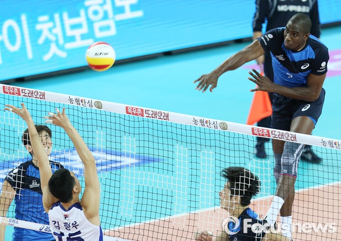 (인천=포커스뉴스) 12일 인천 계양체육관에서 열린 '2015-2016NH농협 V-리그' 남자부 대한항공-현대캐피탈 경기에서 현대캐피탈 오레올이 대한항공 김형우의 블로킹을 따돌리며 백어택을 하고 있다.