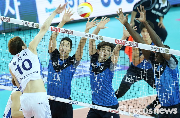 (인천=포커스뉴스) 12일 인천 계양체육관에서 열린 '2015-2016NH농협 V-리그' 남자부 대한항공-현대캐피탈 경기에서 대한항공 정지석의 스파이크 공격을 현대캐피탈 최민호(11), 노재욱(3), 오레올이 블로킹으로 막고 있다.