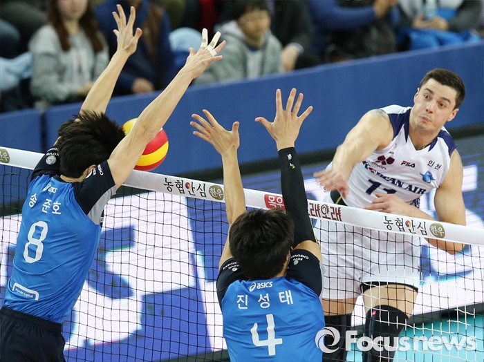(인천=포커스뉴스) 12일 인천 계양체육관에서 열린 '2015-2016NH농협 V-리그' 남자부 대한항공-현대캐피탈 경기에서 대한항공 모로즈가 현대캐피탈 송준호, 진성태의 블로킹 위로 강스파이크를 때리고 있다.