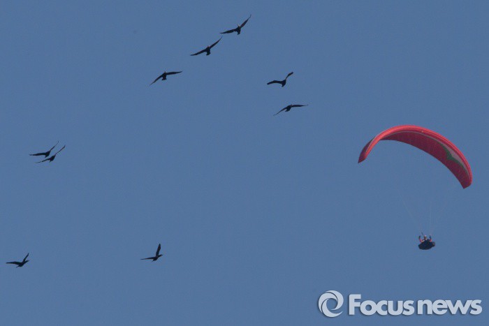 (남양주=포커스뉴스) 13일 오전 경기도 남양주시 조안면 예봉산에서 하강한 패러그라이딩 시민과때마침 한강 하류에서 팔당댐근처로 이동하는 가마우지떼가 공중에서 만나고 있다.
