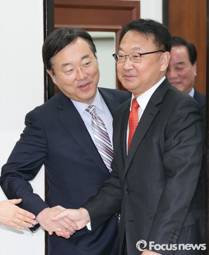 (서울=포커스뉴스) 취임식을 앞둔 유일호(오른쪽) 신임 경제부총리 겸 기획재정부 장관이 13일 오전 서울 여의도 국회 새누리당 대표최고위원실에서 김종석 여의도연구원장과 인사하고 있다.