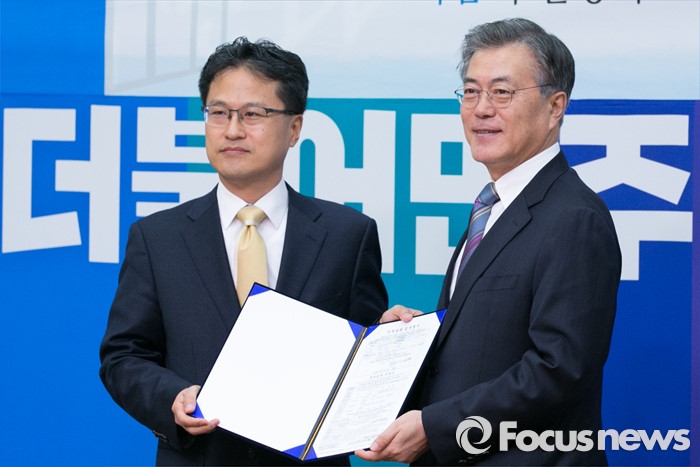 (서울=포커스뉴스) 문재인(오른쪽) 더불어민주당 대표가 13일 오전 서울 여의도 국회에서 재정부 국고국 과장을 역임한 국가재정 전문가 김정우(왼쪽) 세종대 교수의 입당식에 참석해 기념사진을 찍고 있다. 김 교수의 부친은 김철배 더민주 강원도당 고문으로 12대 총선부터 15대 총선까지 5번(보선 1회 포함)을 철원, 화천, 양구 지역에서 범민주당의 이름으로 출마해, 5번 내리 낙선했다.