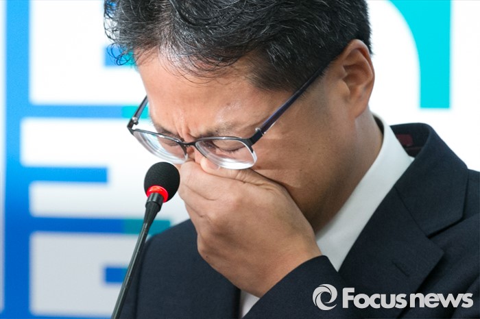 (서울=포커스뉴스) 재정부 국고국 과장을 역임한 국가재정 전문가 김정우 세종대 교수가 13일 오전 서울 여의도 국회 더불어민주당 대표회의실에서 입당 기자회견을 하며 눈물을 흘리고 있다. 김 교수의 부친은 김철배 더민주 강원도당 고문으로 12대 총선부터 15대 총선까지 5번(보선 1회 포함)을 철원, 화천, 양구 지역에서 범민주당의 이름으로 출마해, 5번 내리 낙선했다.