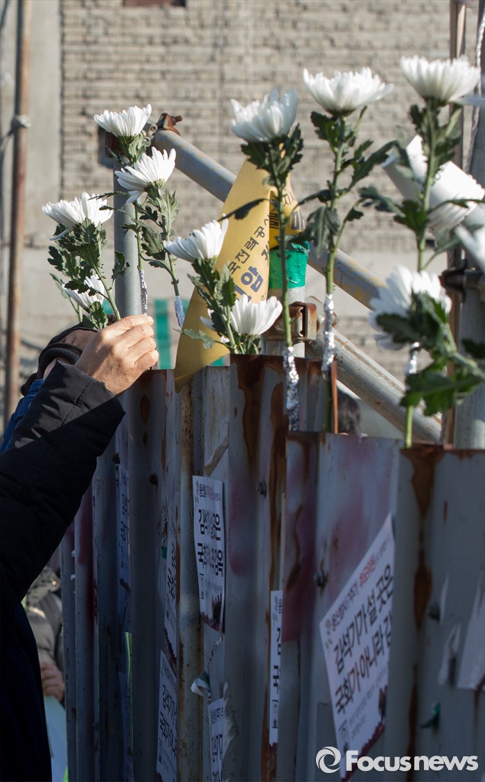 (서울=포커스뉴스) 13일 오전 서울 용산구 남일당 주차장에서 열린 '용산참사 7주기 추모주간 선포' 기자회견에 참석한 용산참사7주기 추모위원회원이 옛 남일당터 울타리에 국화를 바치고 있다.
