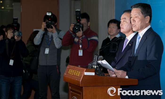 (서울=포커스뉴스) 13일 오전 서울 여의도 국회 정론관에서 장병완(왼쪽), 주승용 더불어민주당 의원이 탈당 기자회견을 하고 있다.