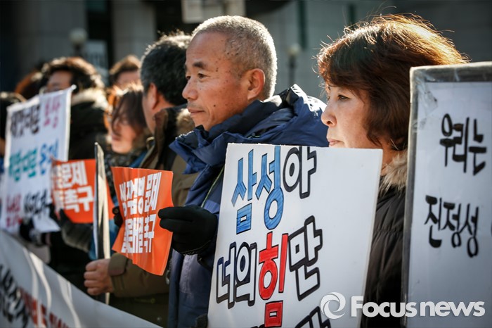 (서울=포커스뉴스) 13일 오전 서울 서초구 삼성전자 본관 앞에서, 반도체 노동자의 건강과 인권지킴이(반올림) 회원과 피해자 가족들이 전날 열린 조정위원회 합의 내용에 대한 입장을 밝히며 사과 및 보상 문제에 대한 조속한 해결을 촉구하고 있다.