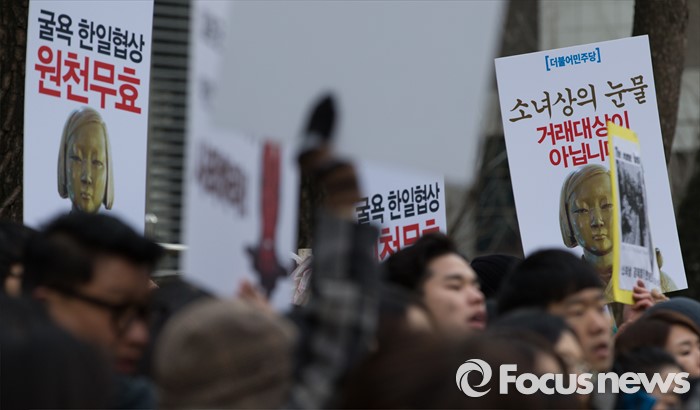 (서울=포커스뉴스) 13일 오후 서울 종로구 구 일본대사관 앞에서 열린 제1213차 일본군 위안부 문제해결을 위한 정기수요집회에서 참가자들이 손피켓을 들고 있다.