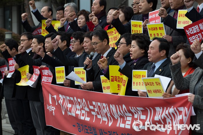 (수원=포커스뉴스) 누리과정 예산을 포함한 올해 예산안 심의를 위한 임시회 본회의 예정일인 13일 오후 경기도의회 앞에서 새누리당 의원들이 '경기도교육감은 누리과정 예산을 반드시 편성하라'는 기자회견을 하고 있다.