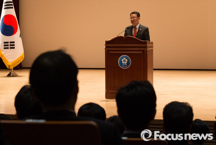 (세종=포커스뉴스) 유일호 신임 경제부총리 겸 기획재정부장관이 13일 오후 세종시 정부세종청사 대강당에서 열린 취임식에 참석해 취임사를 하고 있다.