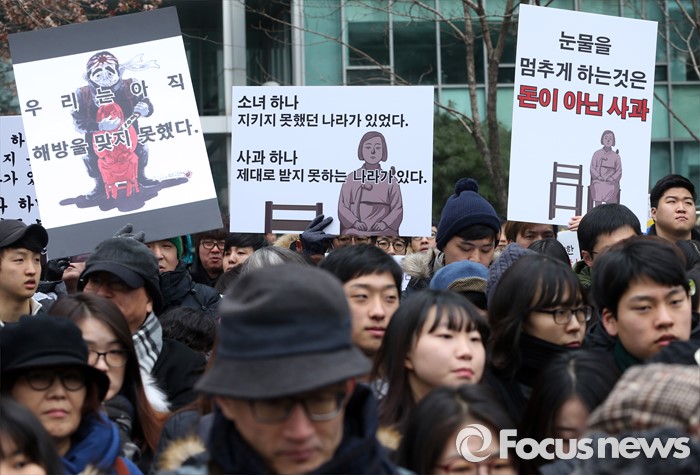 (서울=포커스뉴스) 13일 오후 서울 종로구 옛 일본대사관 앞에서 열린 제1213차 일본군 위안부 피해자 문제 해결 위한 정기 수요시위에서 참가자들이 일본정부의 공식 사과를 촉구 하고 있다.