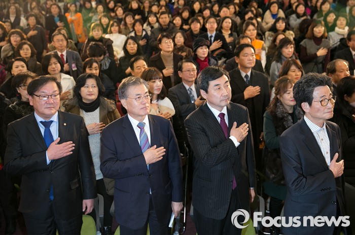 (서울=포커스뉴스) 13일 오후 서울 여의도 국회 의원회관에서 더불어민주당 누리과정특위 주최로 열린 임박한 보육대란, 어떻게 해결할 것인가 긴급 현안토론회에 참석한 김태년(왼쪽부터) 누리과정특위 위원장, 문재인 대표, 이종걸 원내대표, 이목희 정책위의장이 국기에 대한 경례를 하고 있다.