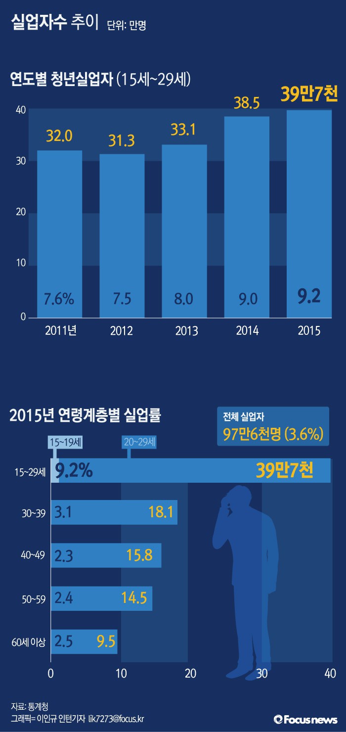 (서울=포커스뉴스) 통계청이 13일 발표한 '고용동향'에 따르면 지난해 총 실업자수는 97만6000명으로 2014년 대비 4만명 증가했다.전체 실업률은 3.6%로 0.1%포인트(p) 상승했다. 지난해 청년(15~29세) 실업률은 사상 최고치를 갈아치웠다. 전년대비 1만2000명 늘었다.
