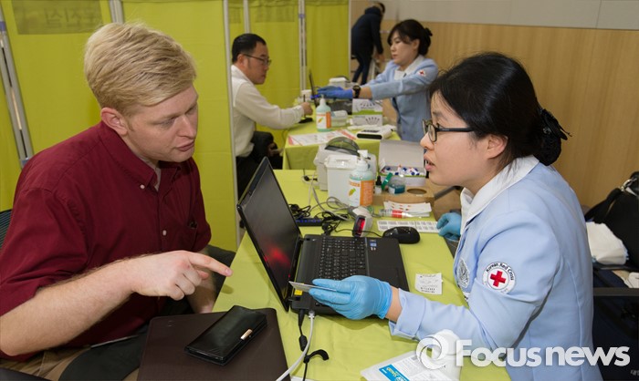 (세종=포커스뉴스) 13일 오후 세종시 정부세종청사 1동 대강당에서 열린 '국무총리실과 함께하는 사랑의 헌혈' 에 외국인 국무총리실 산하단체 직원이 헌혈을하기 위해 검사를 받고 있다.