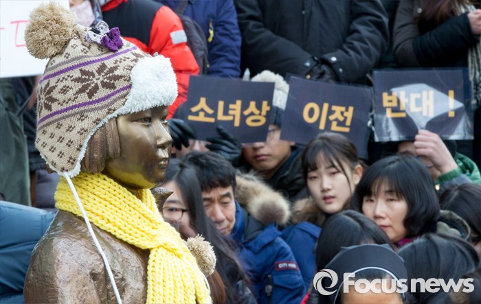 (서울=포커스뉴스) 13일 오후 서울 종로구 옛 일본대사관 앞에서 열린 제1213차 정기수요집회에서 참석자들이 '소녀상 이전 반대'라는 문구가 적힌 손팻말을 들고 있다.