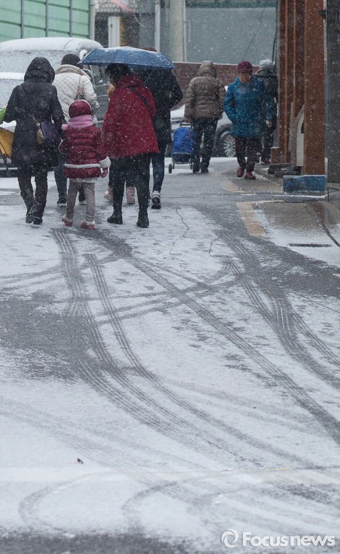 (서울=포커스뉴스) 서울을 포함한 중부지방에 많은 눈이 내린 13일 오후 서울 강북구 한 생활도로에서 시민들이 발걸음을 재촉하고 있다.