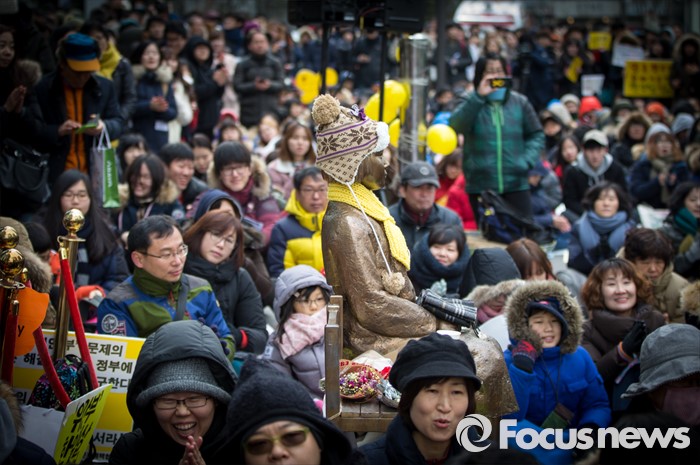 (서울=포커스뉴스) 13일 오후 서울 종로구 옛 일본대사관 앞에서 열린 제1213차 정기수요집회에가 많은참석자들로 붐비고 있다.