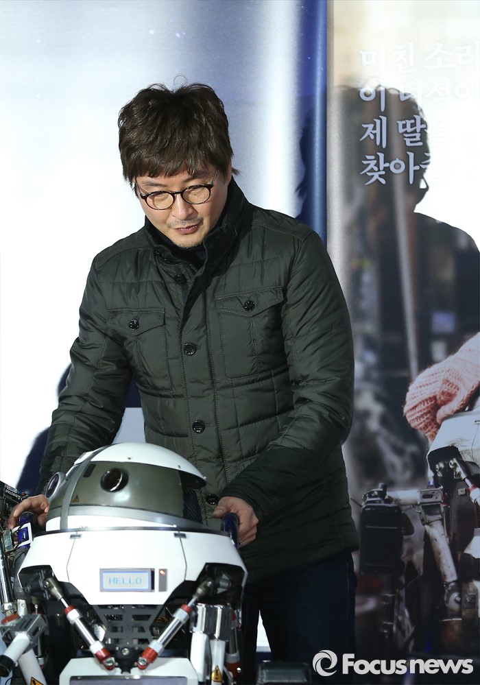 (서울=포커스뉴스) 13일 오후 서울 광진구 롯데시네마 건대입구점에서 열린 영화 '로봇, 소리' 언론시사회에 참석한 영화감독 이호재가 기자간담회 전 극중 출연한 로봇인 소리의 위치를 정하고 있다.