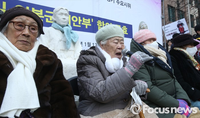 (서울=포커스뉴스) 13일 오후 서울 종로구 옛 일본대사관 앞에서 열린 제1213차 일본군 위안부 피해자 문제 해결 위한 정기 수요시위에 자리한 이옥선 할머니가 발언 하고 있다.