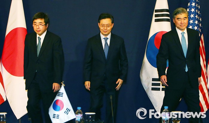 (서울=포커스뉴스) 13일 오후 서울 중구 롯데호텔에서 열린 한미일 6자회담수석 긴급회동에서 황준국 외교부 한반도평화교섭본부장(가운데)과 성 김 미국 국무부 대북정책특별대표(오른쪽), 이시카네 기미히로 일본 아시아대양주국장이 인사를 나눈 뒤 각자의 자리로 가고 있다.