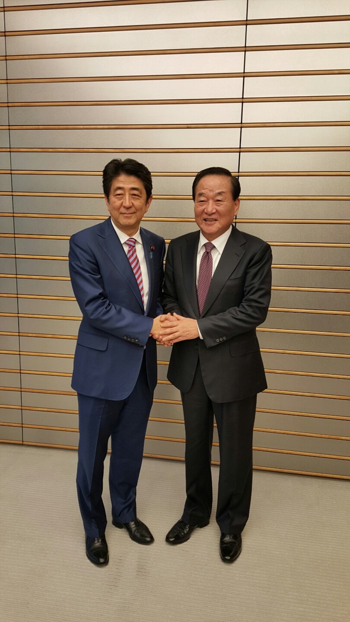 (서울=포커스뉴스) 13일(현지시간) 일본 도쿄 총리관저에서 서청원 새누리당 최고위원과 아베 신조 일본 총리가 면담을 마치고 기념촬영을 하고 있다. <사진제공=서청원 의원실>
