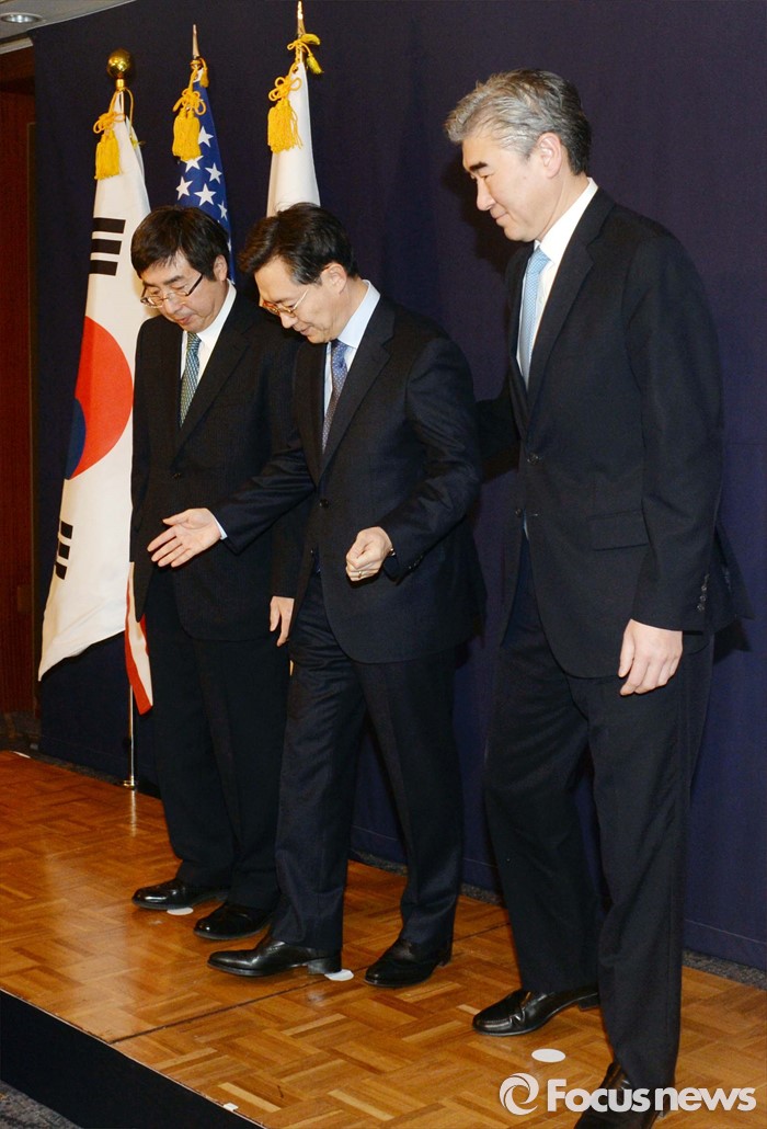 (서울=포커스뉴스) 한미일 6자회담 수석대표가 4차 핵실험을 감행한 북한에 대한 강력하고 실효적인 제재 방안 논의를 위해 13일 오후 서울 소공동 롯데호텔에서 만나 악수한 뒤 자리로 향하고 있다. 왼쪽부터 이시카네 기미히로(石兼公博) 일본 아시아대양주국장, 황준국 외교부 한반도평화교섭본부장, 성 김 미 국무부 대북정책특별대표.