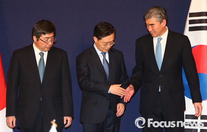 (서울=포커스뉴스) 한미일 6자회담 수석대표가 4차 핵실험을 감행한 북한에 대한 강력하고 실효적인 제재 방안 논의를 위해 13일 오후 서울 소공동 롯데호텔에서 만나 악수하고 있다. 왼쪽부터 이시카네 기미히로(石兼公博) 일본 아시아대양주국장, 황준국 외교부 한반도평화교섭본부장, 성 김 미 국무부 대북정책특별대표.