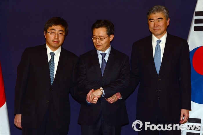 (서울=포커스뉴스) 한미일 6자회담 수석대표가 4차 핵실험을 감행한 북한에 대한 강력하고 실효적인 제재 방안 논의를 위해 13일 오후 서울 소공동 롯데호텔에서 만나 악수하고 있다. 왼쪽부터 이시카네 기미히로(石兼公博) 일본 아시아대양주국장, 황준국 외교부 한반도평화교섭본부장, 성 김 미 국무부 대북정책특별대표.
