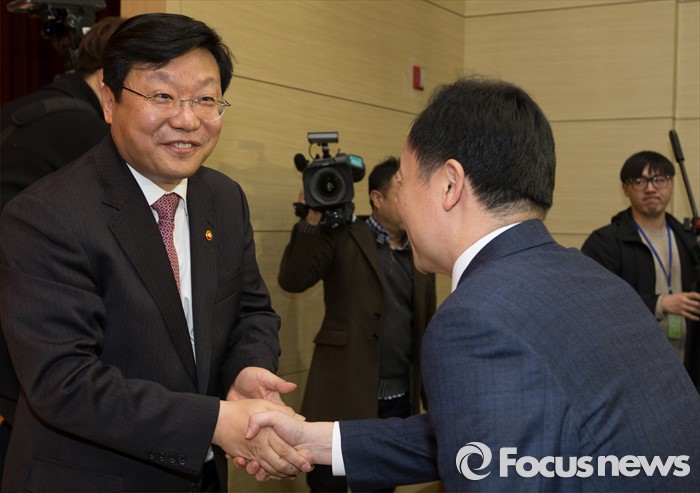 (세종=포커스뉴스) 주형환 신임 산업통상자원부장관이 13일 오후 세종시 정부세종청사 산업부 대강당에서 열린 취임식에 참석해 직원과 악수를 하고 있다.