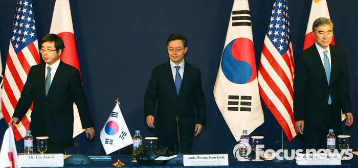 (서울=포커스뉴스) 13일 오후 서울 중구 롯데호텔에서 열린 한미일 6자회담수석 긴급회동에서 황준국 외교부 한반도평화교섭본부장(가운데)과 성 김 미국 국무부 대북정책특별대표(오른쪽), 이시카네 기미히로 일본 아시아대양주국장이 인사를 나눈 뒤 각자의 자리로 가고 있다.