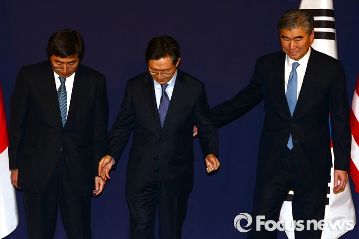 (서울=포커스뉴스) 한미일 6자회담 수석대표가 4차 핵실험을 감행한 북한에 대한 강력하고 실효적인 제재 방안 논의를 위해 13일 오후 서울 소공동 롯데호텔에서 만나 악수한 뒤 자리로 향하고 있다. 왼쪽부터 이시카네 기미히로(石兼公博) 일본 아시아대양주국장, 황준국 외교부 한반도평화교섭본부장, 성 김 미 국무부 대북정책특별대표.