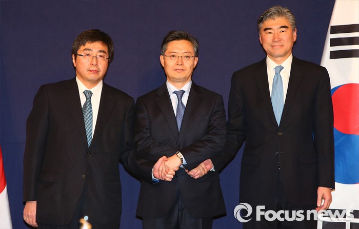 (서울=포커스뉴스) 한미일 6자회담 수석대표가 4차 핵실험을 감행한 북한에 대한 강력하고 실효적인 제재 방안 논의를 위해 13일 오후 서울 소공동 롯데호텔에서 만나 악수하고 있다. 왼쪽부터 이시카네 기미히로(石兼公博) 일본 아시아대양주국장, 황준국 외교부 한반도평화교섭본부장, 성 김 미 국무부 대북정책특별대표.