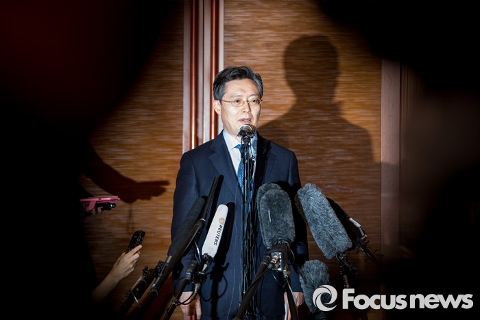 (서울=포커스뉴스) 황준국 외교부 한반도평화교섭본부장이 13일 오후 서울 중구 롯데호텔에서 열린 '한미일 6자회담 수석대표 긴급회동'에 자리해 북한 4차 핵실험 강행 관련 대북제재 방안 논의를 마친 뒤 입장발표를 하고 있다.