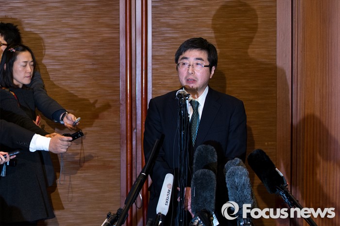 (서울=포커스뉴스) 이시카네 기미히로 일본 아시아대양주국장이 13일 오후 서울 중구 롯데호텔에서 열린 '한미일 6자회담 수석대표 긴급회동'에 자리해 북한 4차 핵실험 강행 관련 대북제재 방안 논의를 마친 뒤 입장발표를 하고 있다.