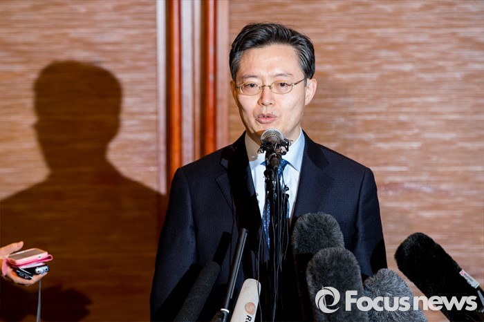 (서울=포커스뉴스) 황준국 외교부 한반도평화교섭본부장이 13일 오후 서울 중구 롯데호텔에서 열린 '한미일 6자회담 수석대표 긴급회동'에 자리해 북한 4차 핵실험 강행 관련 대북제재 방안 논의를 마친 뒤 입장발표를 하고 있다.