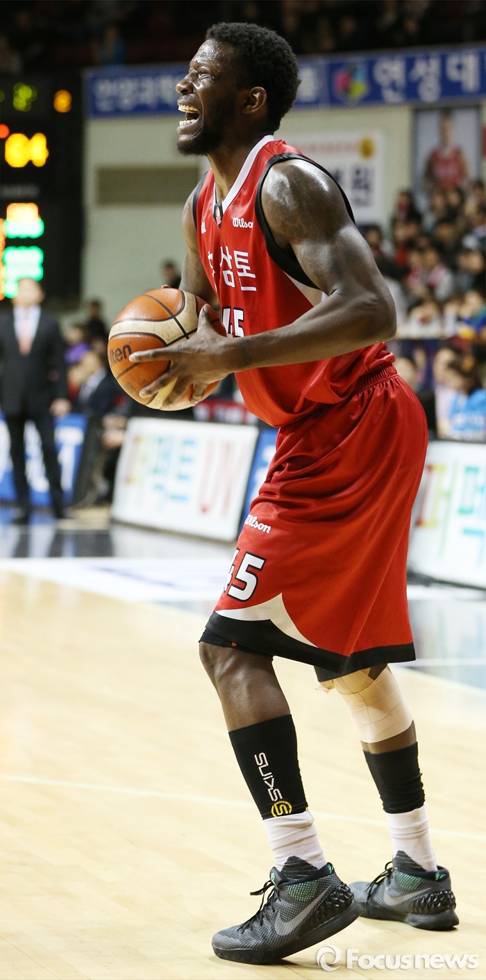 (안양=포커스뉴스) 13일 안양실내체육관에서 열린 2015-2016 프로농구 KGC-KCC 경기에서 KGC 마리오 리틀이 경기 도중 왼발에 쥐가 나자 고통스러워하고 있다.