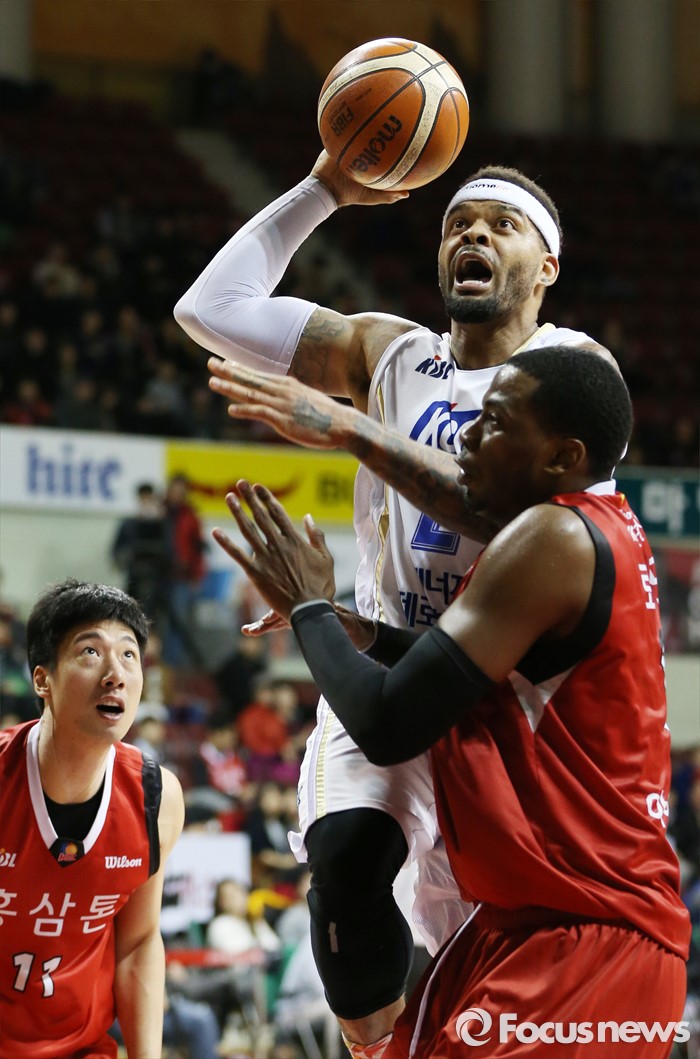 (안양=포커스뉴스) 13일 안양실내체육관에서 열린 2015-2016 프로농구 KGC-KCC 경기에서 KCC 안드레 에밋이 KCC 찰스 로드의 수비를 제치고 원핸드슛을 시도하고 있다.