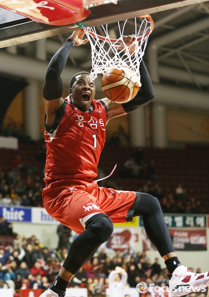 (안양=포커스뉴스) 13일 안양실내체육관에서 열린 2015-2016 프로농구 KGC-KCC 경기에서 KGC 찰스 로드가 투핸드 덩크슛을 성공시키고 있다.