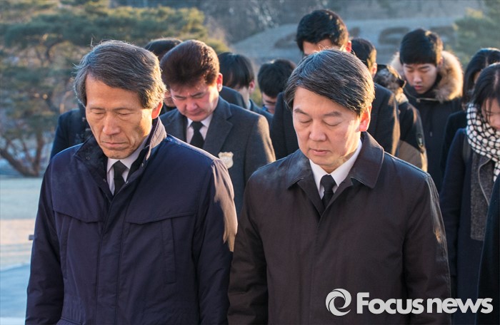 (서울=포커스뉴스) 14일 오전 서울 강북구 국립 4.19 민주묘지를 찾은 한상진(왼쪽 부터) 국민의당 창당준비위원장과 안철수 인재영입위원장이 분향 후 묵념하고 있다.