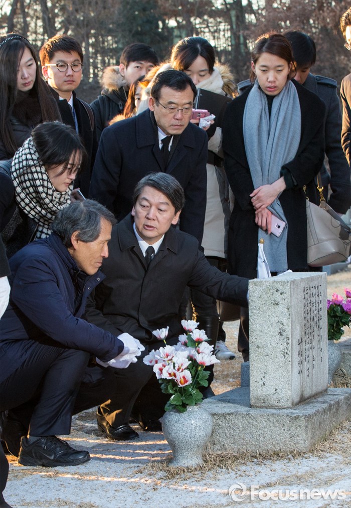 (서울=포커스뉴스) 14일 오전 서울 강북구 국립 4.19 민주묘지를 찾은 한상진 국민의당 창당준비위원장과 안철수 인재영입위원장이 혁명의 도화선이 됐던 고 김주열 열사의 묘비를 어루만지고 있다.