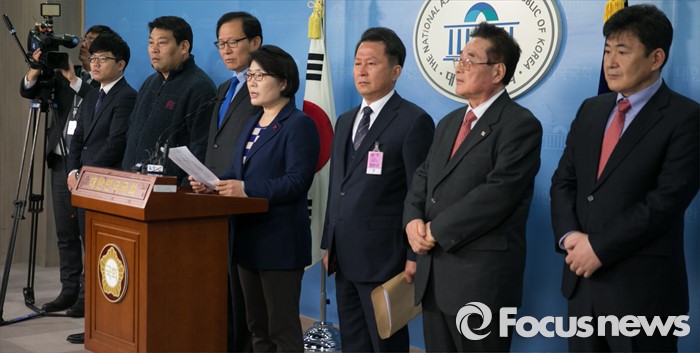 (서울=포커스뉴스) 안귀옥 더불어민주당 인천 남구을 지역위원장과 20대 총선 인천 남구갑 총선 출마를 준비 중인 김충래 변호사 등이 14일 오전 서울 여의도 국회 정론관에서 탈당 및 국민의당 합류 기자회견을 하고 있다.