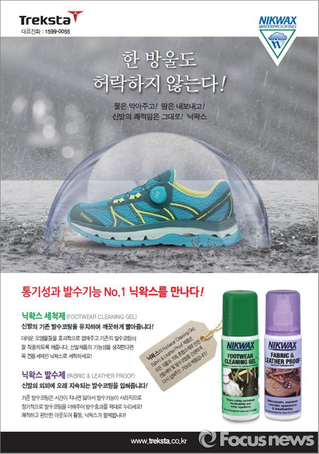 한편, 닉왁스는 제품에 탄화불소·솔벤트·에어로졸 등 유해물질을 전혀 사용하지 않는 업체다. 전 세계 50여 개국에서 유해 물질 없는 기능성 의류·신발·장비용 세탁제·발수처리제 등을 판매하고 있다.트렉스타와 닉왁스의 친환경 마케팅 포스터 <사진제공=트렉스타>